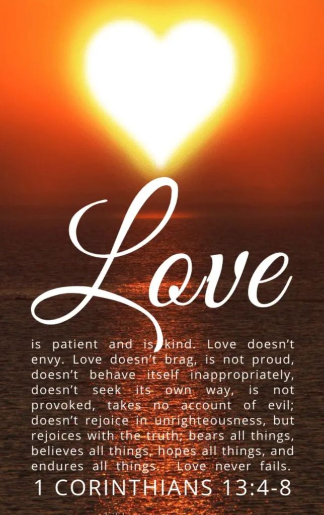 1 Corinthians 13:4-8 NIV – Love is patient, love is kind. It does not envy, it does not boast, it is not proud. 5 It does not dishonour others, it is not self-seeking, it is not easily angered, it keeps no record of wrongs. 6 Love does not delight in evil but rejoices with the truth. 7 It always protects, always trusts, always hopes, always perseveres. 8 Love never fails. But where there are prophecies, they will cease; where there are tongues, they will be stilled; where there is knowledge, it will pass away.