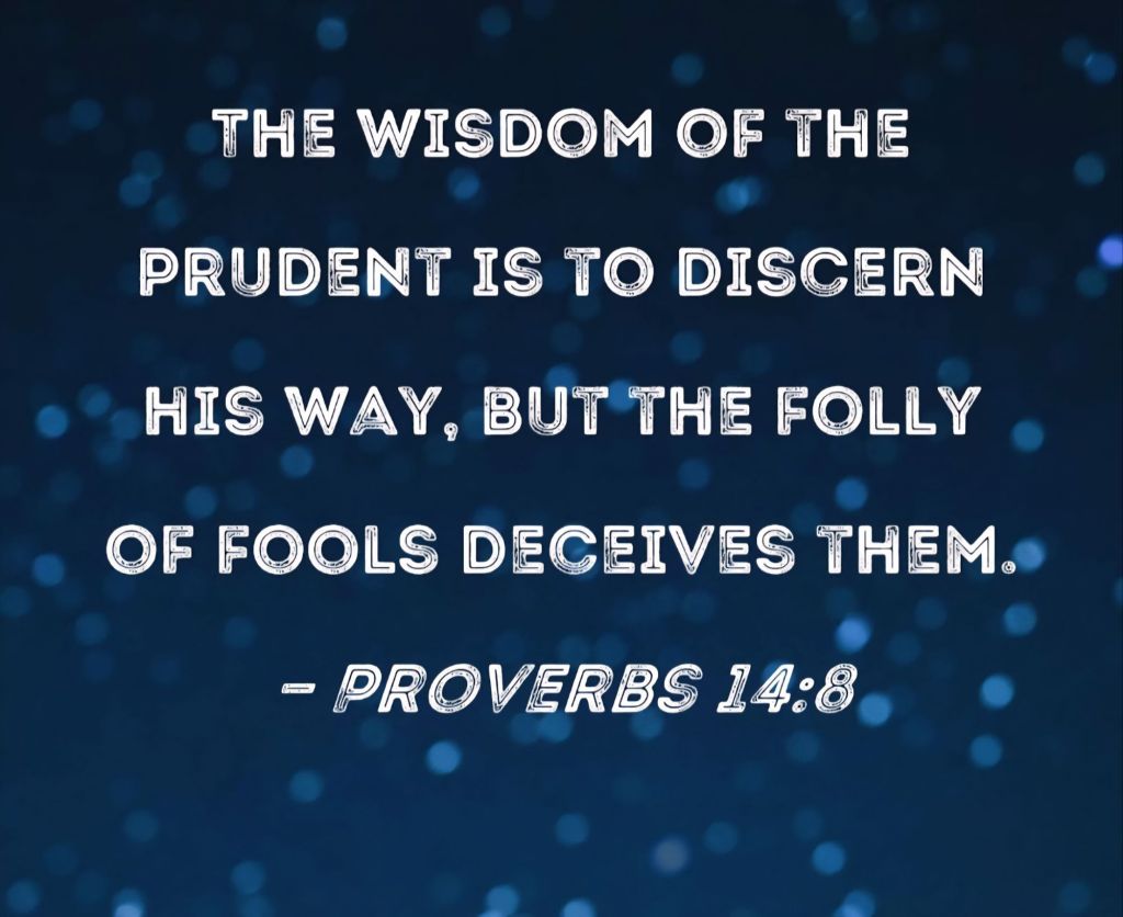 Proverbs 14:7–8, 14-15 (NIV): 7 Stay away from a fool, for you will not find knowledge on their lips. 8 The wisdom of the prudent is to give thought to their ways, but the folly of fools is deception. 14 The faithless will be fully repaid for their ways, and the good rewarded for theirs. 15 The simple believe anything but the prudent give thought to their steps.
