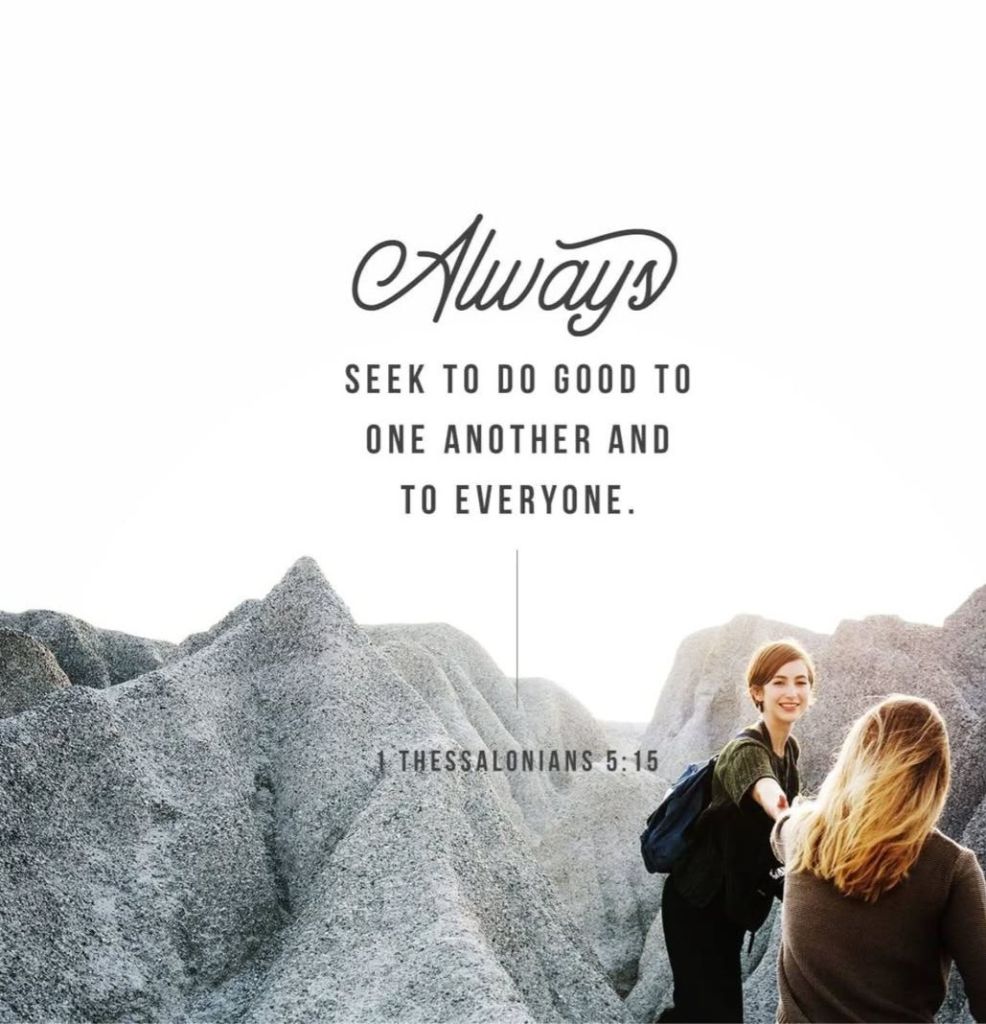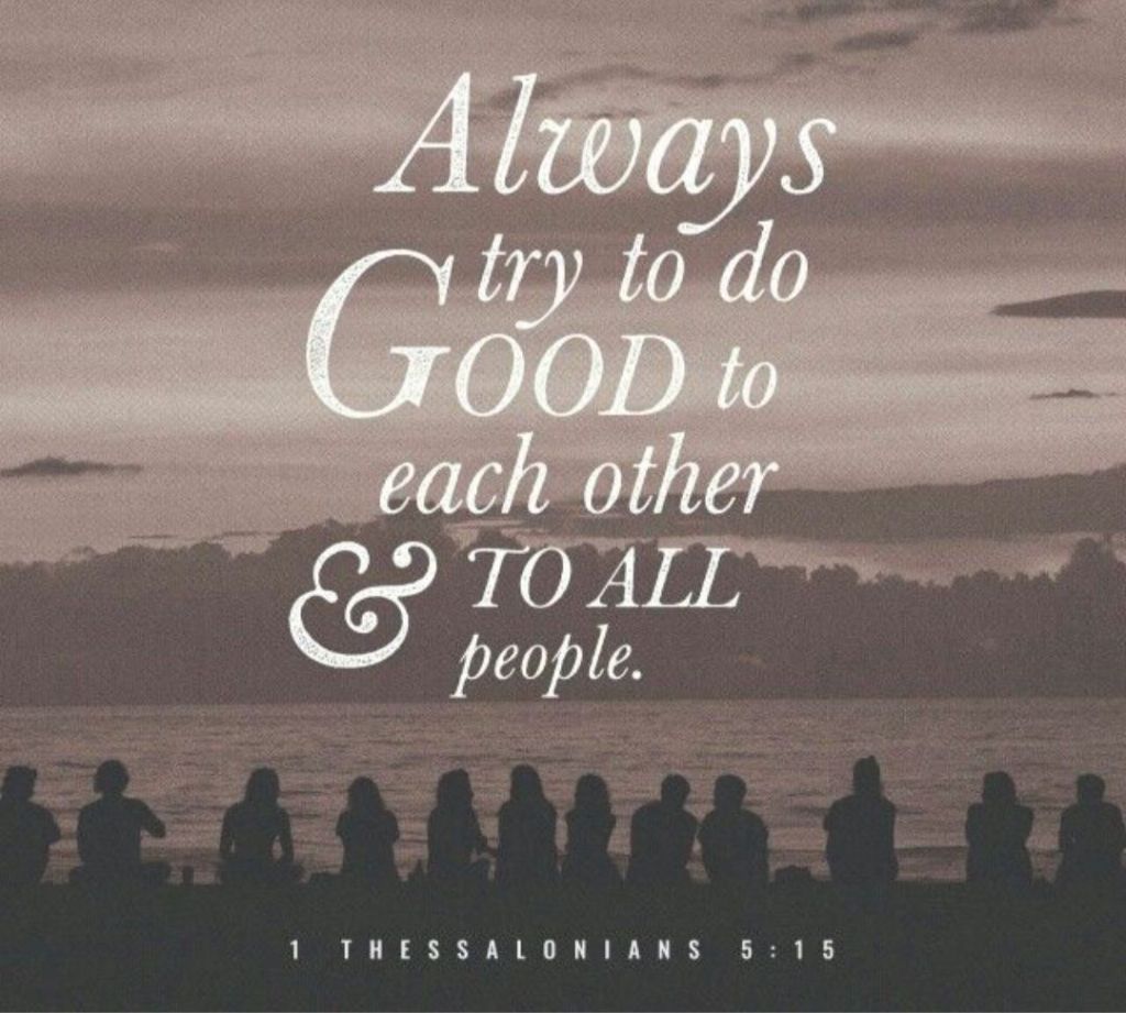 1 Thessalonians 5:15–18 (NIV): 15 Make sure that nobody pays back wrong for wrong, but always strive to do what is good for each other and for everyone else.