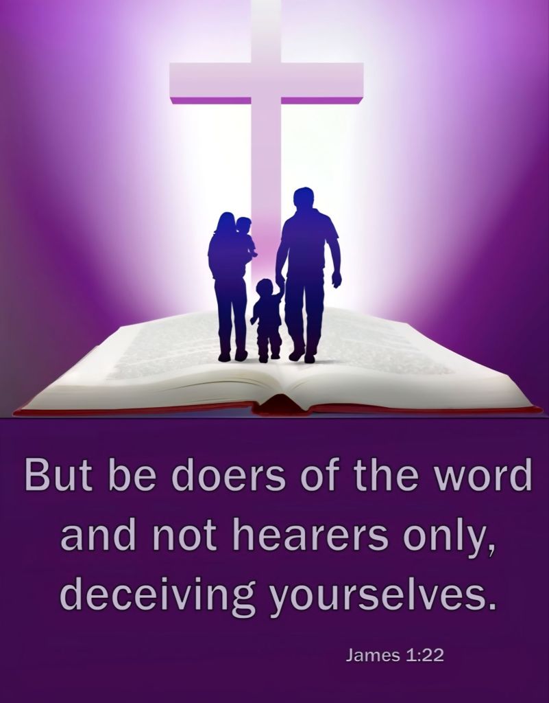 An interesting fact is that the cross reference to James 1:22 is Matthew 7:21 which reads “Not everyone who says to me, ‘Lord, Lord,’ will enter the kingdom of heaven, but only the one who does the will of my Father who is in heaven. Thus, when James says that we ought to not just listen but do what the Word says, it means ultimately that we do the will of the Father. This is because the will of God is embedded in the Word.
