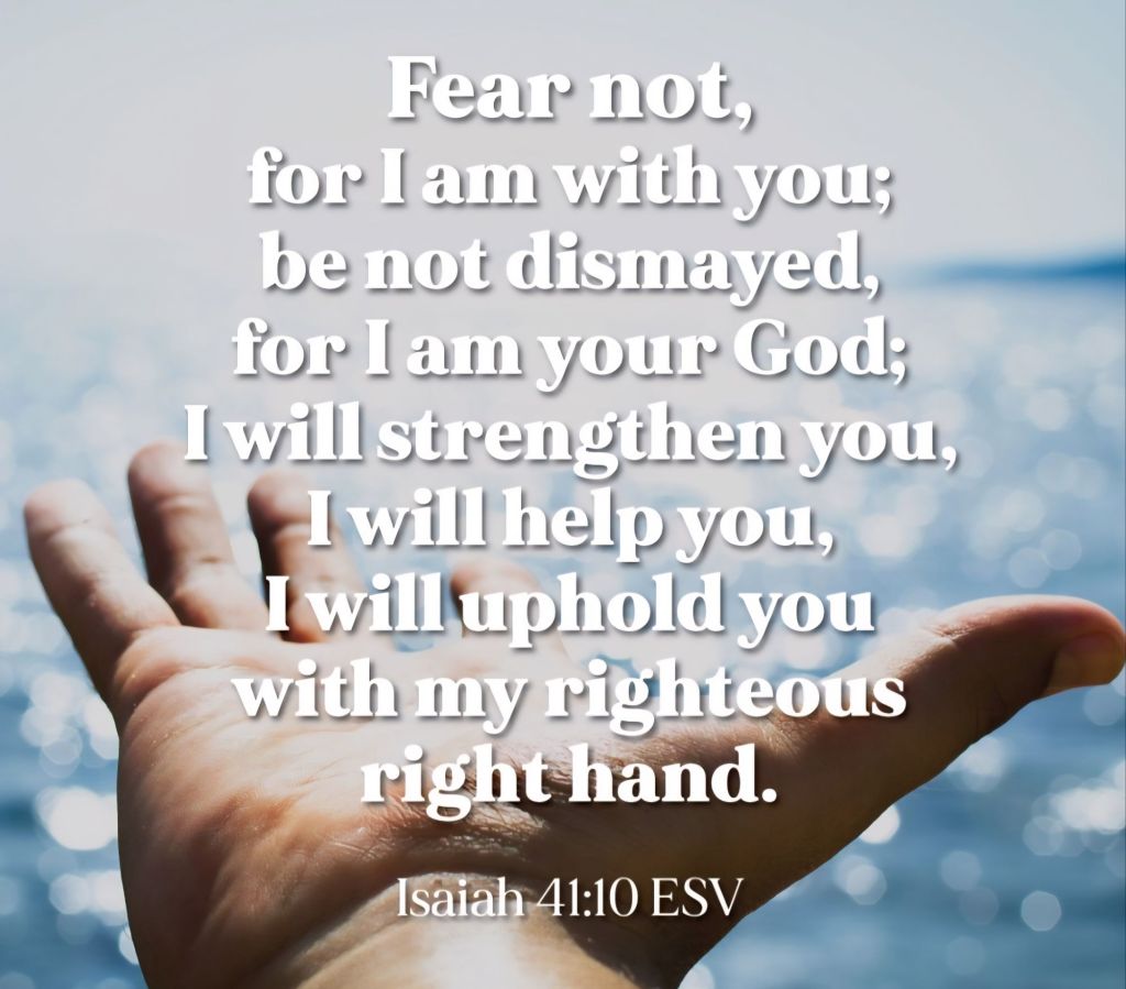 Isaiah 41:10 (NIV) – So do not fear, for I am with you; do not be dismayed, for I am your God. I will strengthen you and help you;